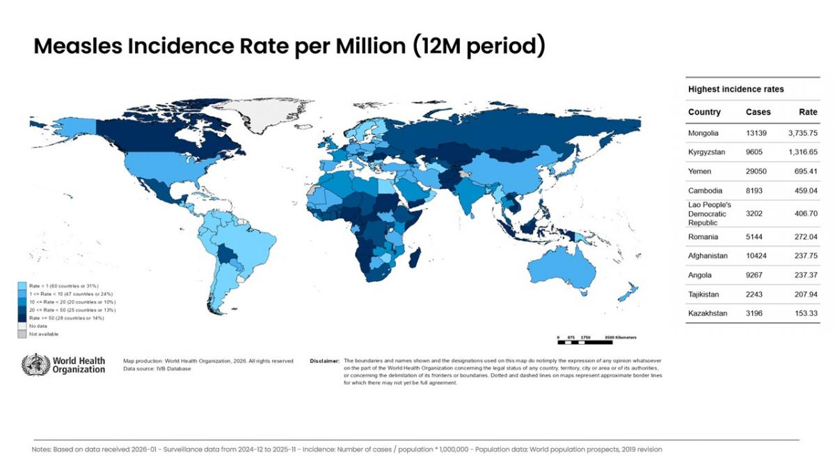Figura 37.2. El sarampión en el mundo en los últimos 12 meses (enero 2026).