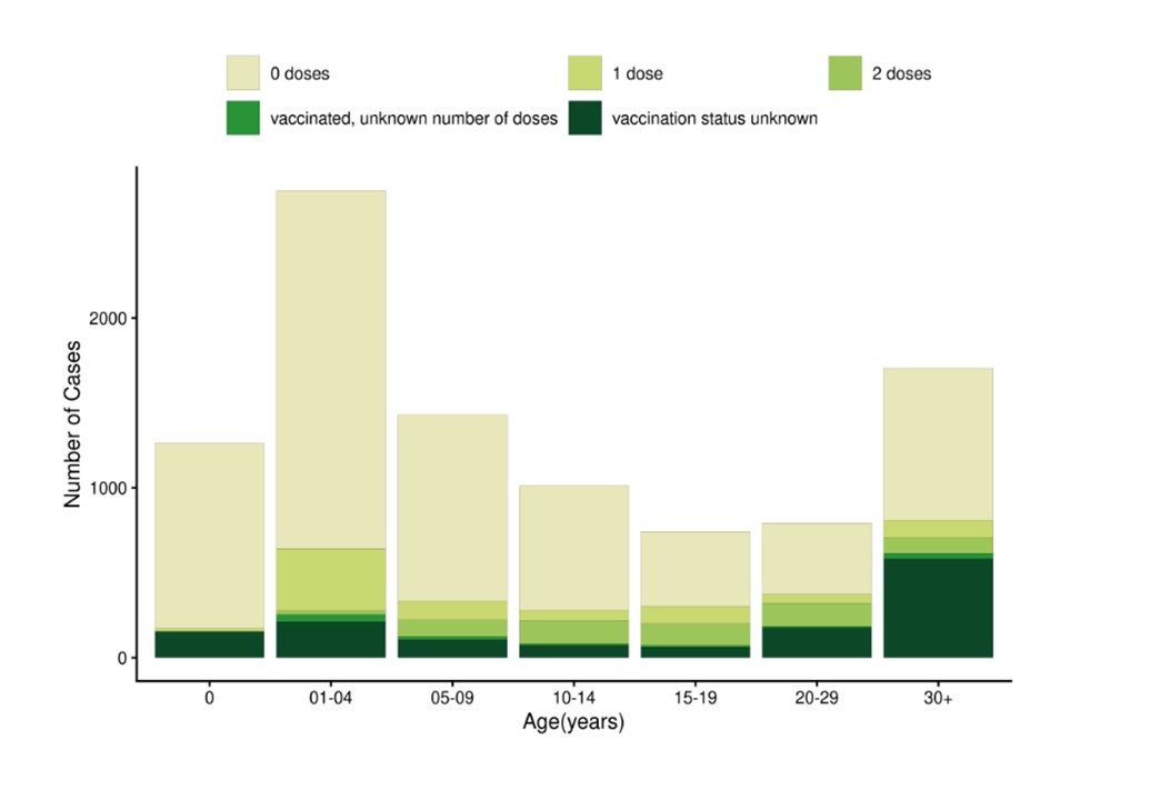 De 8342 casos (94,5 % de todos los casos) con edad y estado de vacunación conocidos, 6788 (81,4 %) no estaban vacunados, 811 (9,7 %) estaban vacunados con una dosis de una vacuna que contenía sarampión, 608 (7,3 %) estaban vacunados con dos o más dosis y 121 (1,5 %) estaban vacunados con un número desconocido de dosis.