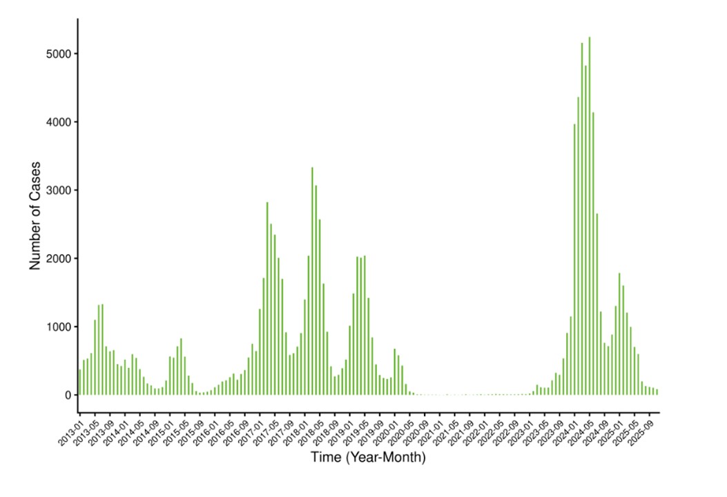 En Reino Unido también se ha informado de un aumento notable de casos en 2024 (casi 3000 casos, el mayor número de casos registrados desde 2012 [LSHTM, 25/mar de 2025]) y durante todo 2025.