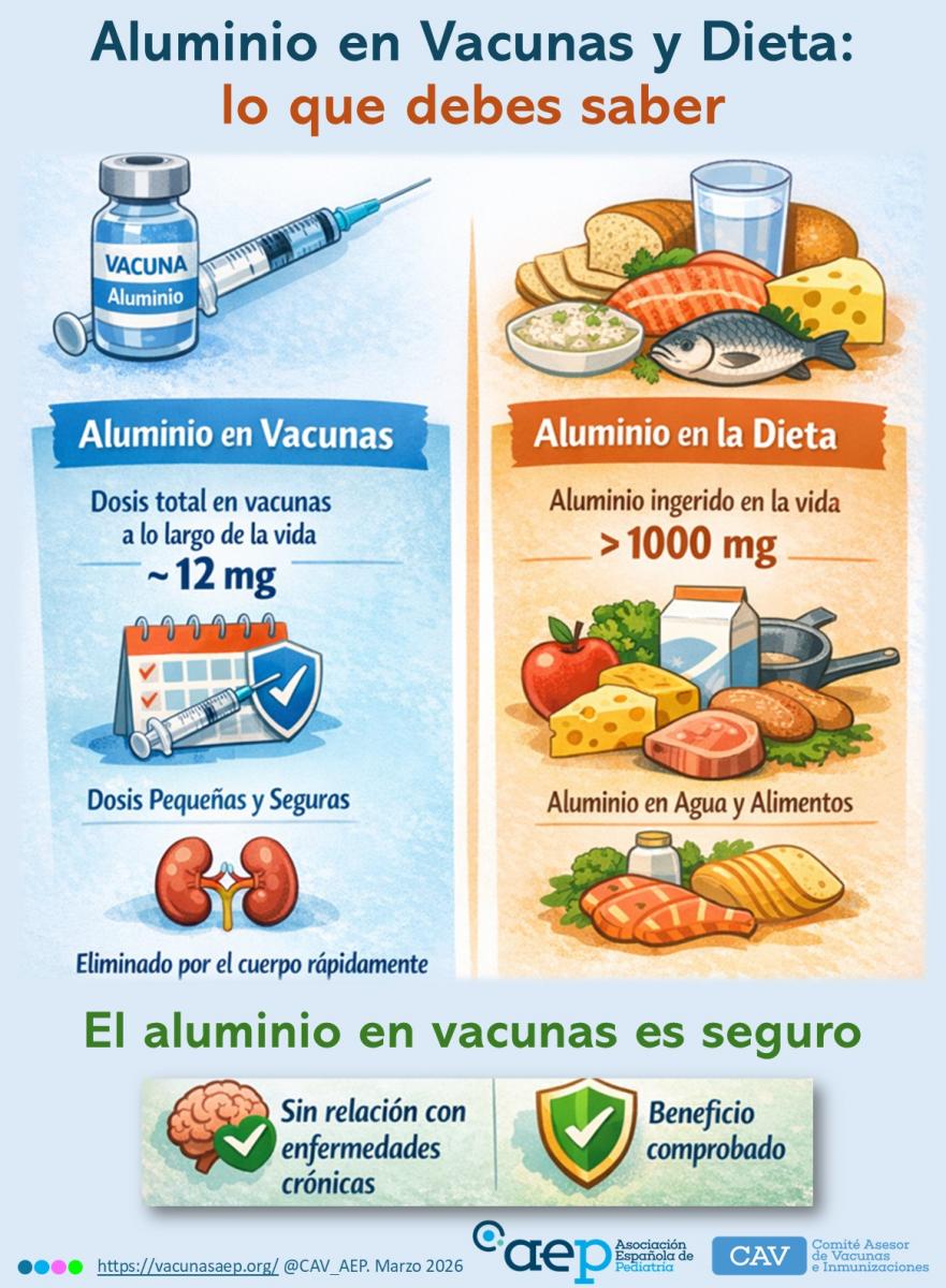 En definitiva, los datos actuales respaldan que el aluminio contenido en las vacunas del calendario sistemático no supone un riesgo para la salud infantil ni adulta, y que su uso continúa siendo una herramienta segura y eficaz para optimizar la protección frente a enfermedades prevenibles por vacunación.