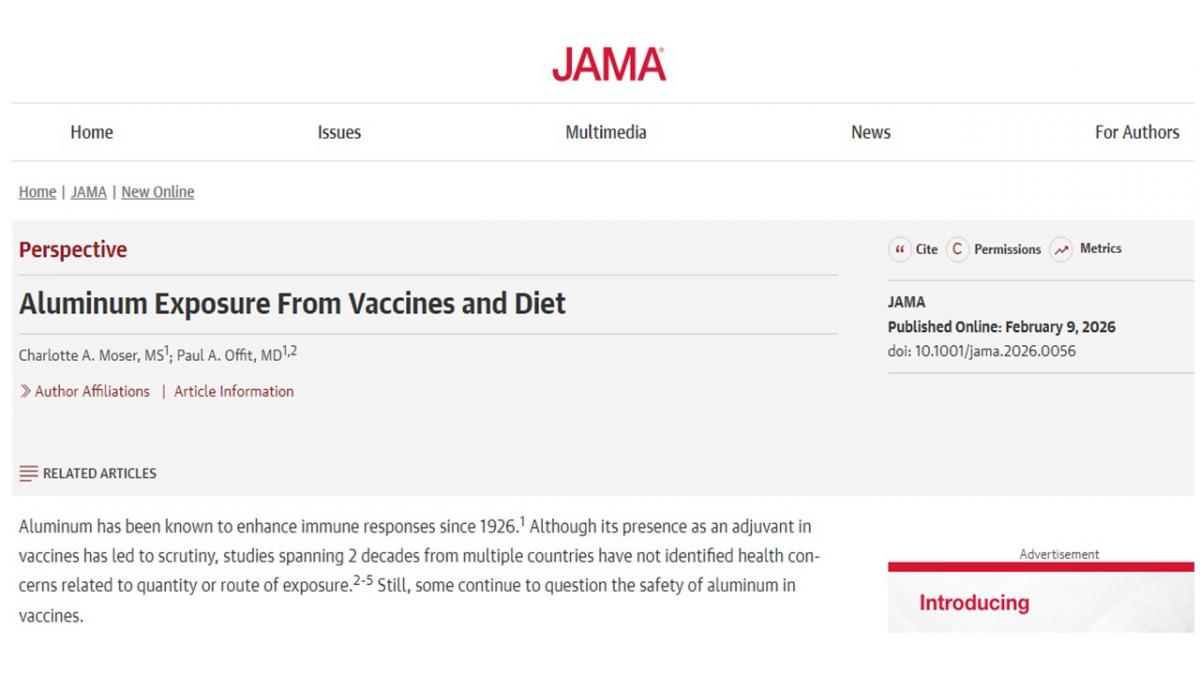 - Moser CA, Offit PA. Aluminum Exposure From Vaccines and Diet. JAMA. Published online February 09, 2026. doi:10.1001/jama.2026.0056.