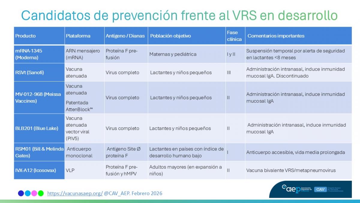 La actualización permite situar estos candidatos dentro del contexto preventivo actual, destacando su potencial para ampliar las estrategias disponibles y anticipar los cambios que podrían producirse en los próximos años en la prevención de la infección por VRS.
