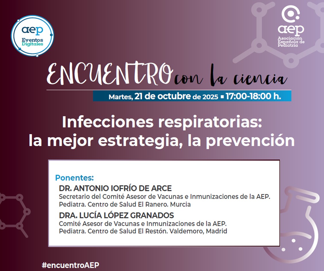Nuestros vocales Antonio Iofrío de Arce y Lucía López Granados nos han ofrecido el pasado 21 de octubre una nueva sesión de Encuentro con la Ciencia de la AEP, en la que han tratado en un formato pregunta-respuesta aspectos prácticos de las campañas de inmunización para la temporada 2025-2026 frente a VRS, gripe y covid-19. Se abordaron también las recomendaciones de vacunación frente al neumococo, especialmente en los grupos de riesgo.