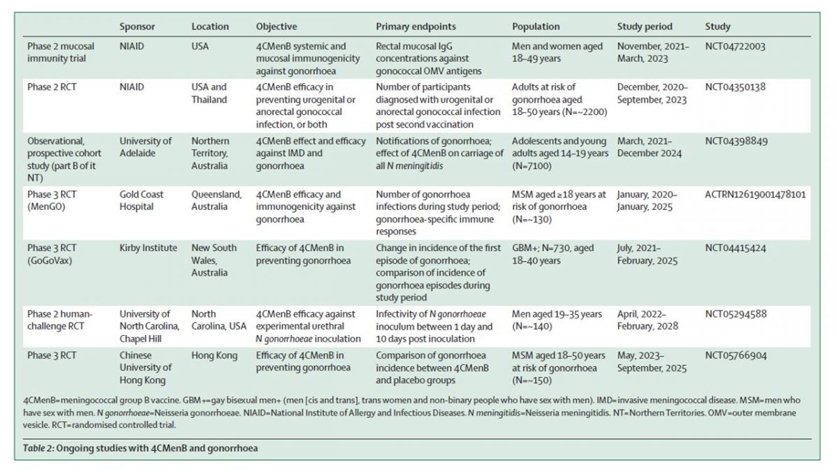 Actualmente, se están llevando a cabo varios ensayos clínicos para evaluar la eficacia de 4CMenB contra la gonorrea en poblaciones con mayor riesgo de infección, con el objetivo de proporcionar evidencia que pueda considerarse más sólida que los estudios observacionales a gran escala (Tabla 2).