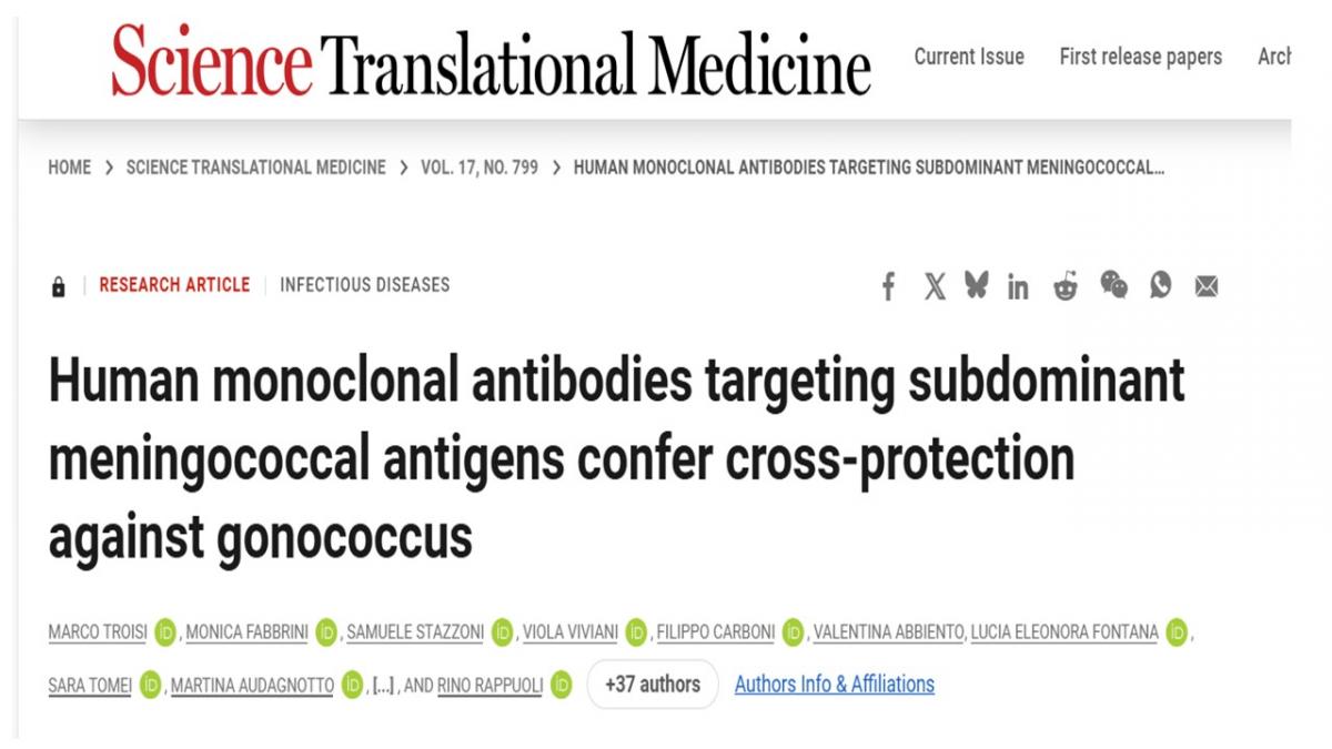 - Troisi M, et al. Human monoclonal antibodies targeting subdominant meningococcal antigens confer cross-protection against gonococcus. Sci Transl Med. 2025;17(799): eadv0969