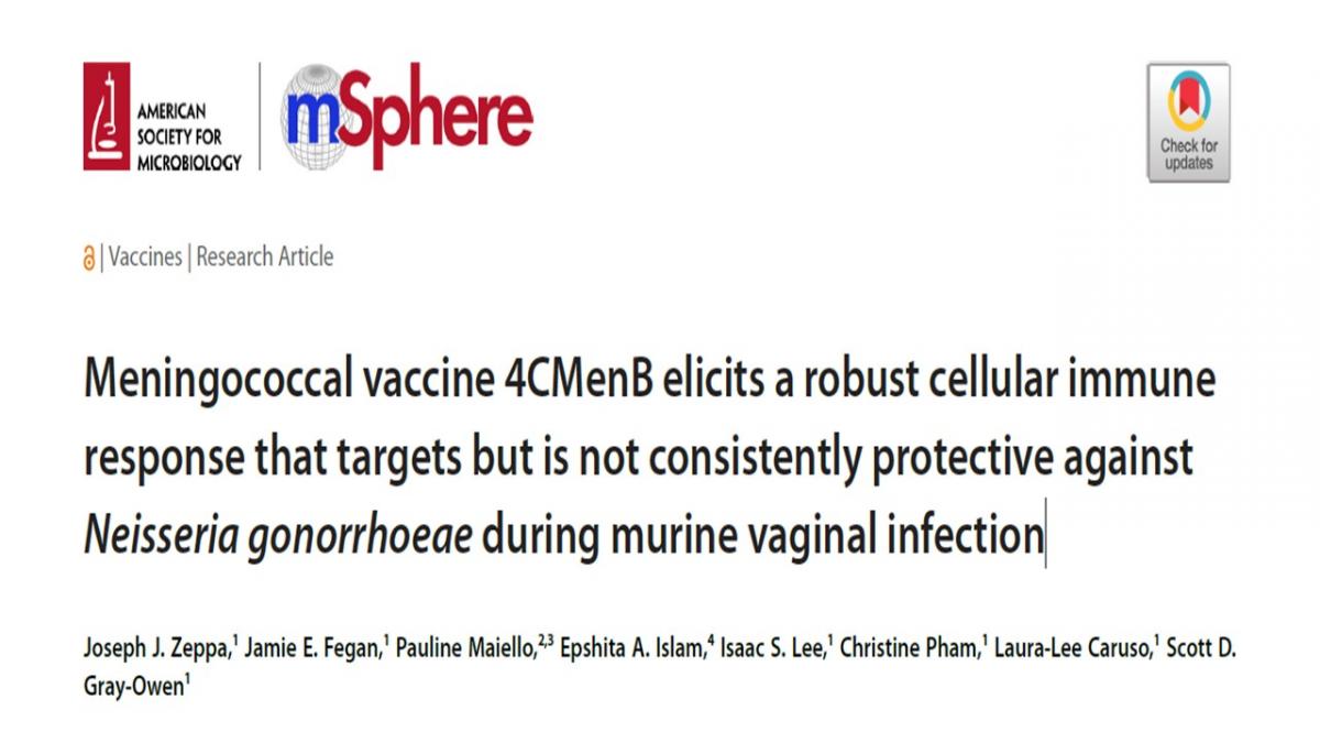 - Zeppa JJ, et al. Meningococcal vaccine 4CMenB elicits a robust cellular immune response that targets but is not consistently protective against Neisseria gonorrhoeae during murine vaginal infection. mSphere. 2025; 10(5):e0094024