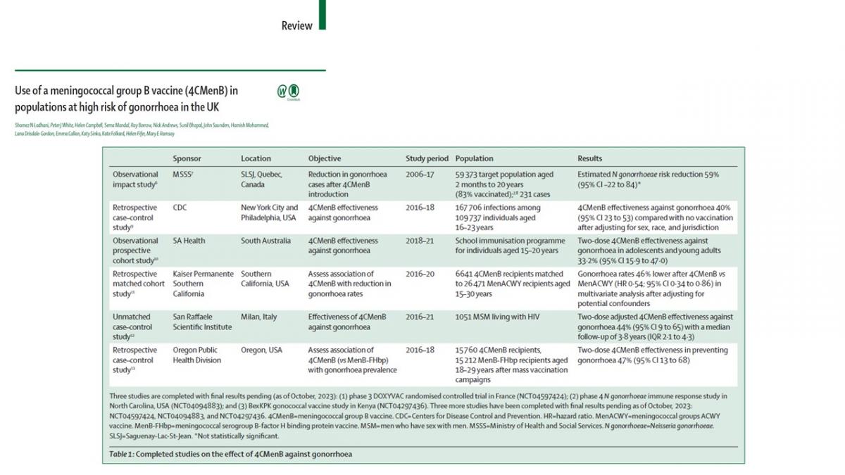 En esta publicación del Lancet Infectious Diseases de 2024 (Ladhani SN, Lancet Infect Dis 2024), los autores resumen la evidencia que respalda el uso de 4CMenB para la protección contra la gonorrea (Tabla 1) y los datos necesarios para fundamentar la planificación de programas a largo plazo y su extensión a la población en general.